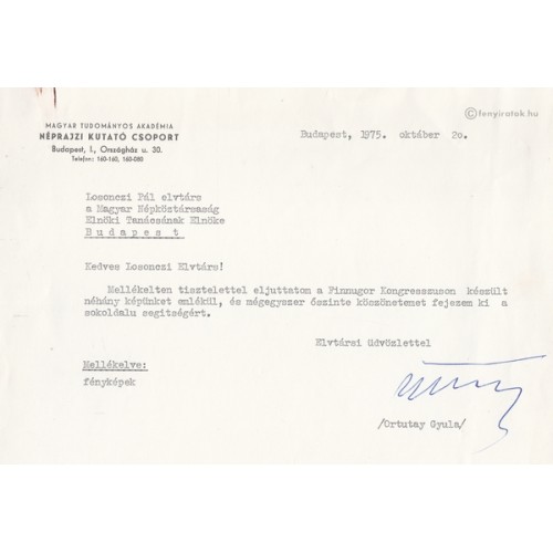 az MTA Néprajzi Kutató Csoport fejléces levélpapírján (147x208), Bp., 1975 X. 20.